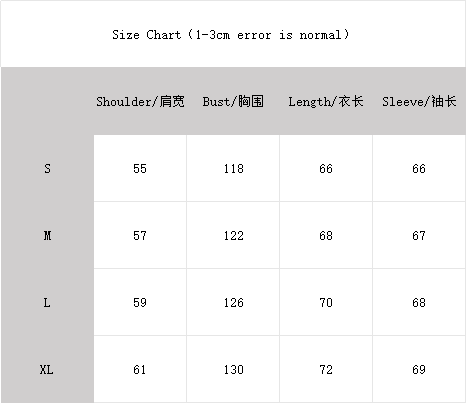 S:   Length 69   Chest 118   Shoulder 55  Sleeve 63 cm